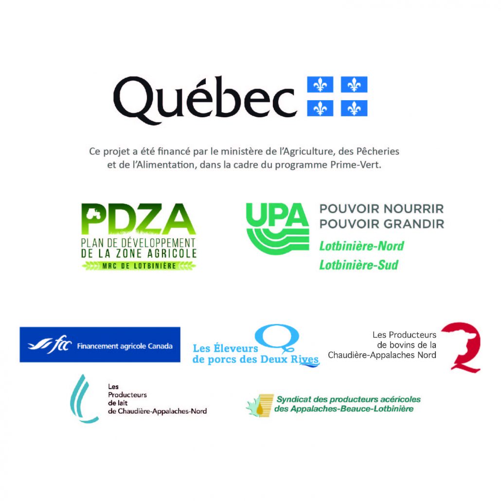 Cette journée est réalisée dans le cadre du volet 3 du programme Prime-Vert 2018-2023 et elle bénéficie d’une aide financière du ministère de l’Agriculture, des Pêcheries et de l’Alimentation. L’évènement est réalisé en partenariat avec le ministère de l’Agriculture, des Pêcheries et de l’Alimentation (MAPAQ), le Plan de développement de la zone agricole (PDZA) de la MRC de Lotbinière, Députée de Lotbinière-Frontenac, l’UPA Lotbinière-Nord, l’UPA Lotbinière-Sud, Financement agricole Canada, Les Éleveurs de porcs des Deux rives, Les Producteurs de bovins de la Chaudière-Appalaches Nord, Les Producteurs de lait de Chaudière-Appalaches-Nord et le Syndicat des producteurs acéricoles des Appalaches-Beauce-Lotbinière.